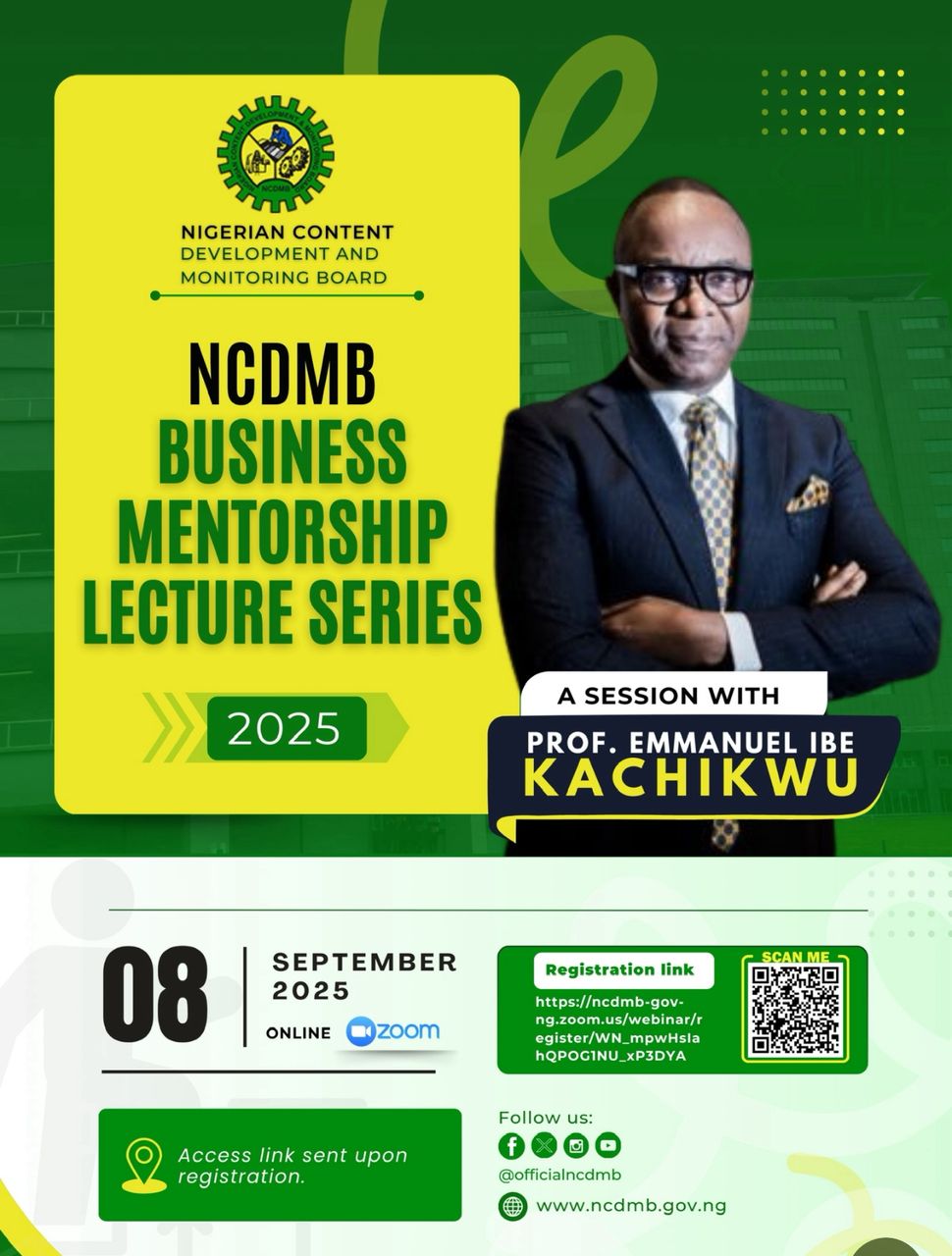 The Nigerian Content Development and Monitoring Board (NCDMB) is delighted to announce that Professor Emmanuel Ibe Kachikwu, former Minister of State for Petroleum Resources, and former chairman of NCDMB’s Governing Council, will serve as the Role Model and Guest Speaker at the NCDMB Business Mentorship Lecture Series (BMLS) for Q3 2025. This edition of the BMLS will be held on Monday, September 8, 2025, from 10am via Zoom […]