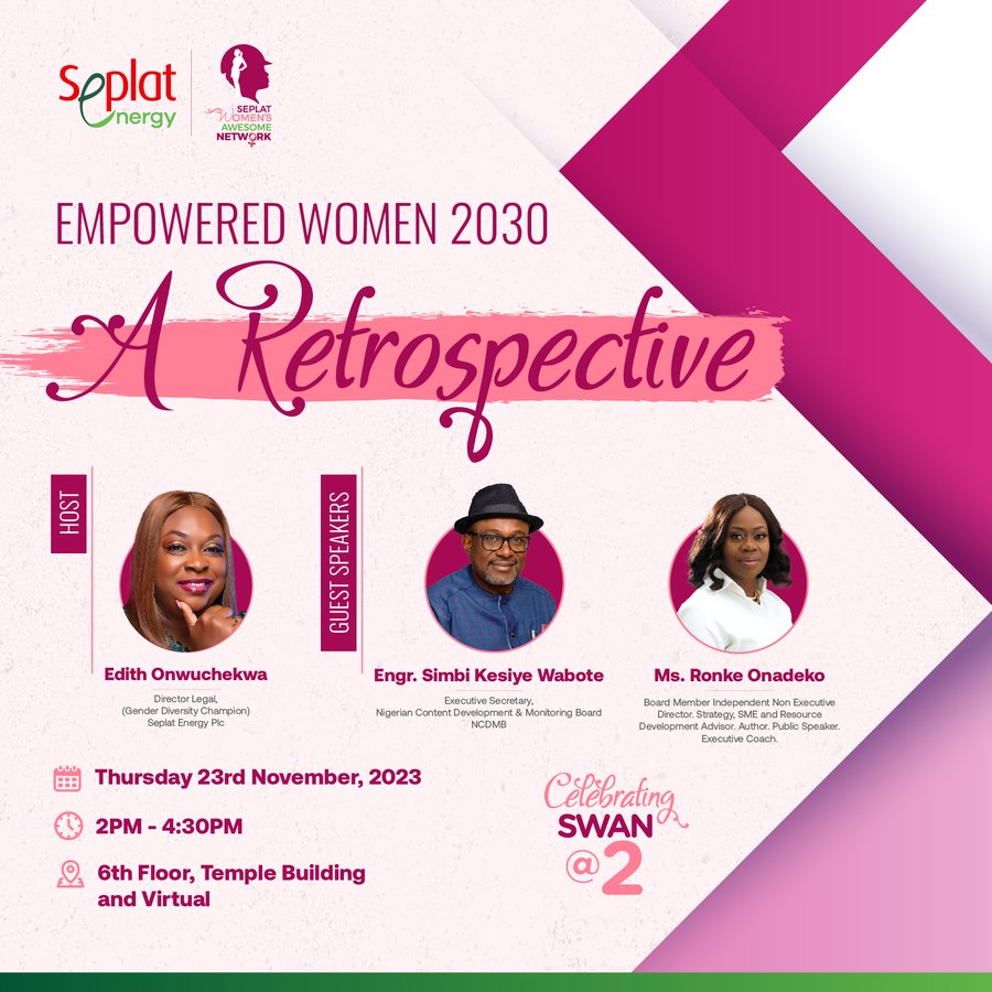 The 2nd Anniversary of SEPLAT Women Awesome Network (SWAN) event themed “Empowered Women 2030 – A Retrospective” was conceived to provide a platform to reflect on women empowerment by the year 2030. It was held at the SEPLAT Energy Head Office, Ikoyi, Lagos.